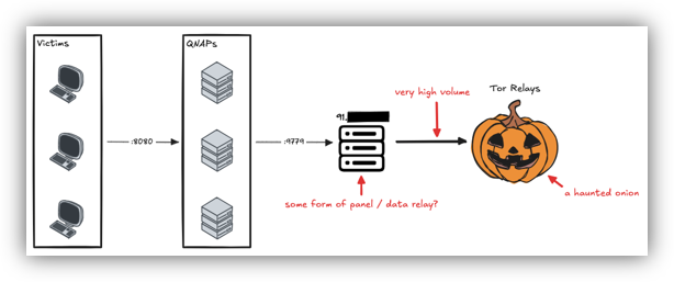 En su análisis más reciente, realizado junto a Team Cymru, Silent Push descubrió una dirección IP utilizada como intermediaria para conectar todos los dispositivos QNAP comprometidos, lo que llevó al hallazgo de más de 180 dominios C2 únicos.