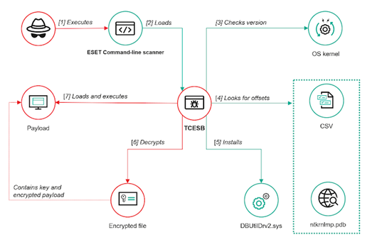 Para ello, TCESB aprovecha otra técnica conocida como BYOVD (bring your own vulnerable driver) para instalar un controlador vulnerable, un controlador Dell DBUtilDrv2.sys, en el sistema a través de la interfaz del Administrador de dispositivos. El controlador DBUtilDrv2.sys es susceptible a un conocido fallo de escalada de privilegios rastreado como CVE-2021-36276.